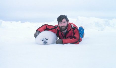 I especially like his expression in the photo at left with what appears to be a baby ribbon seal or possibly a harp seal. I think that I would also smile like that if I was cuddling a ribbon seal.
